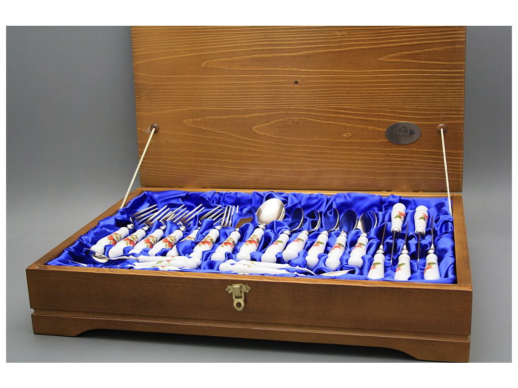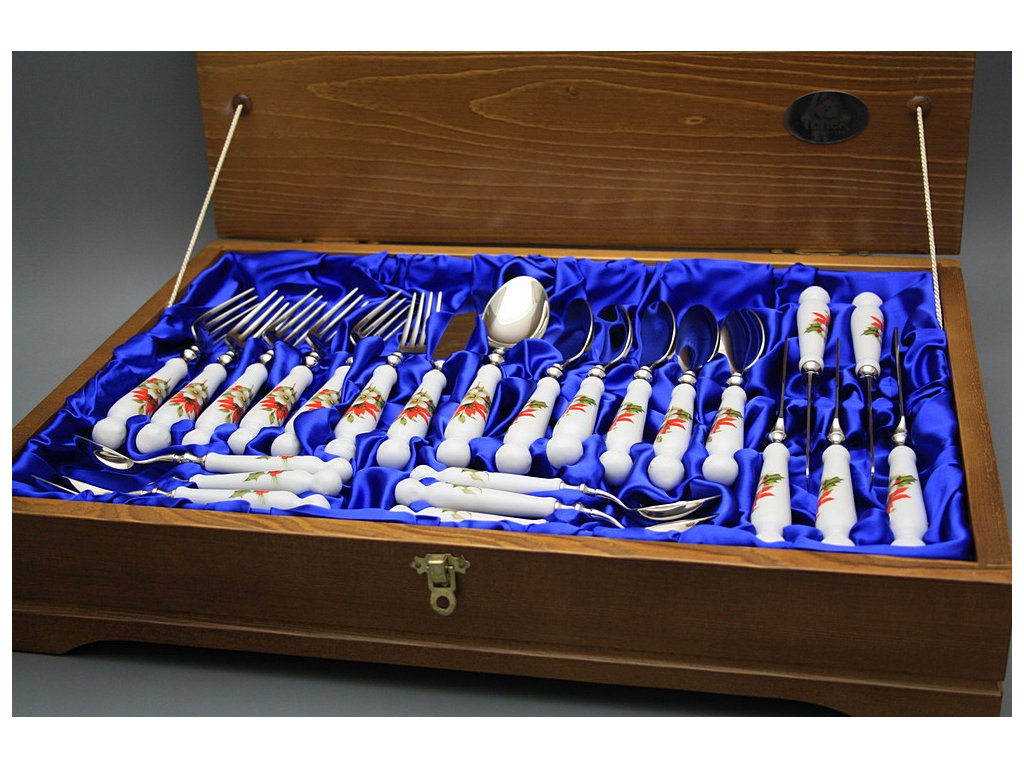 Luxuriöses 24teiliges Besteck Set mit Holzbox aus dem dickwandigen harten Porzellan.