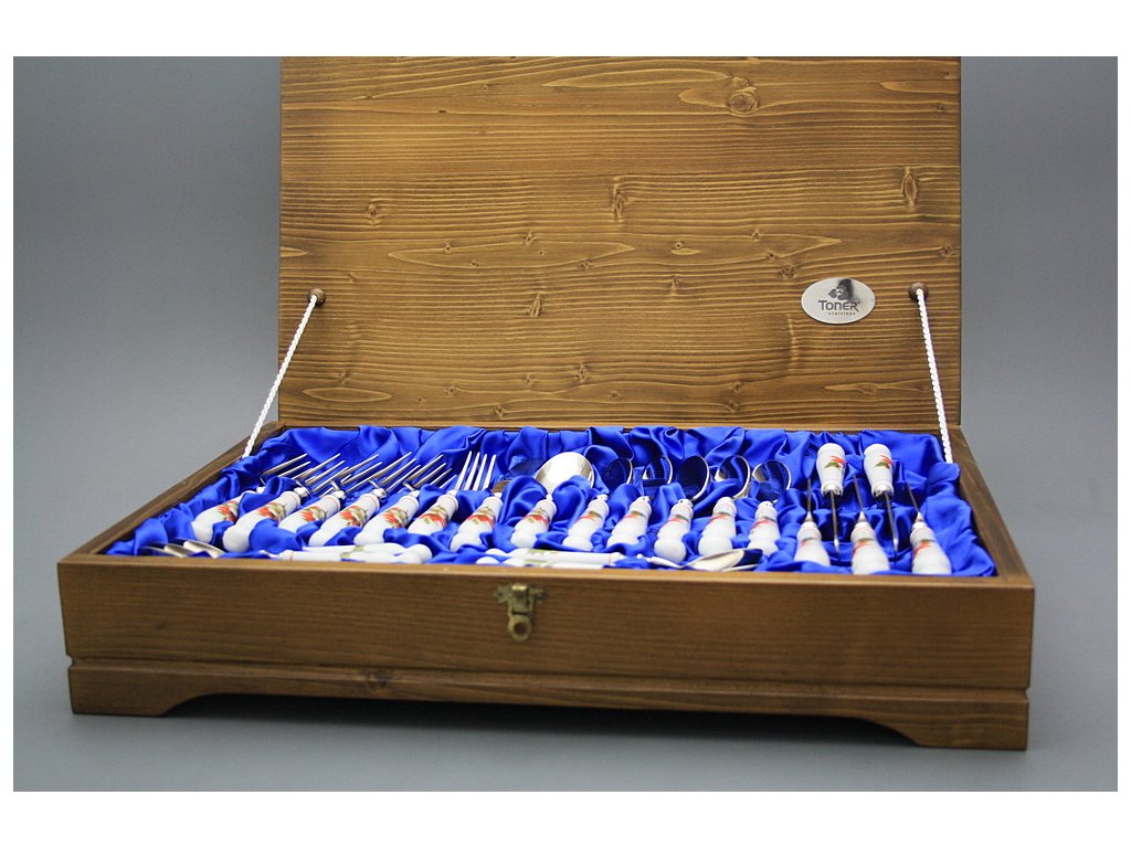 Luxuriöses 24teiliges Besteck Set mit Holzbox aus dem dickwandigen harten Porzellan.
