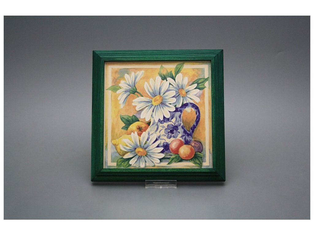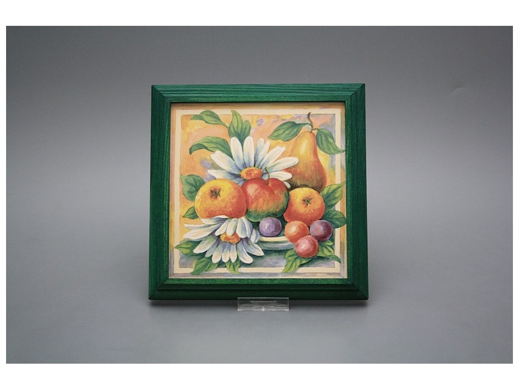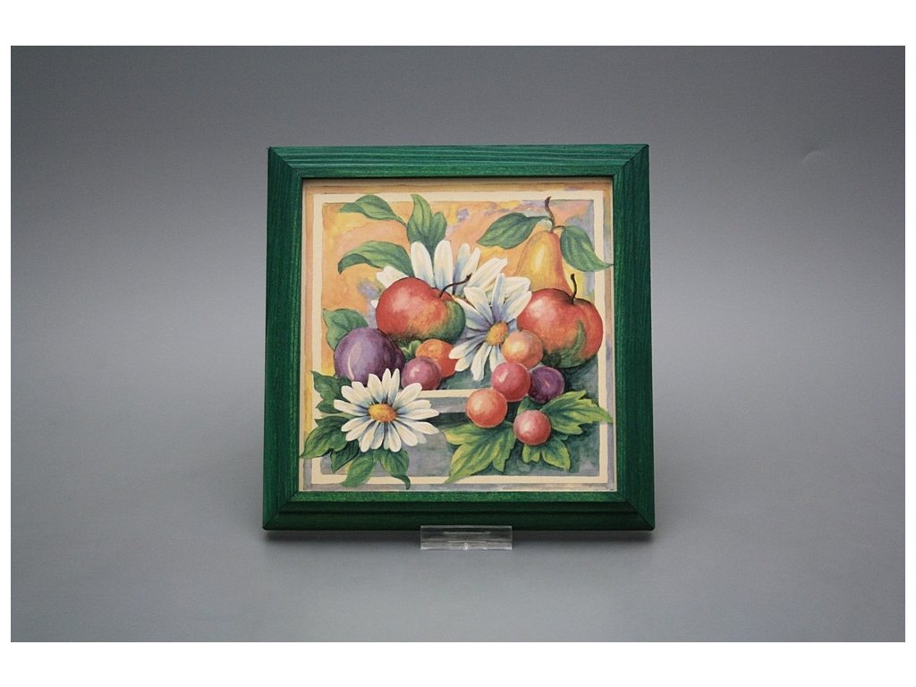 Keramisches Bild zum Aufhängen mit Holzrahmen, Temperatur beim Ausbrennen des Motivs in Höhe von 820°C, abriebfestes, waschbares Dekor.