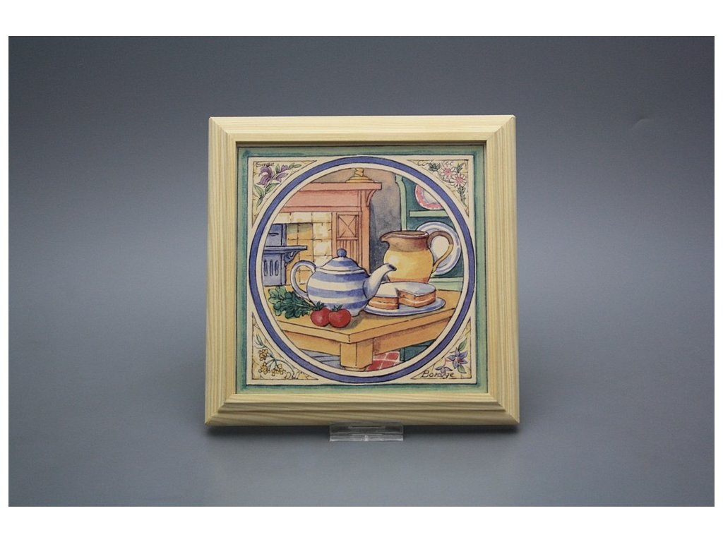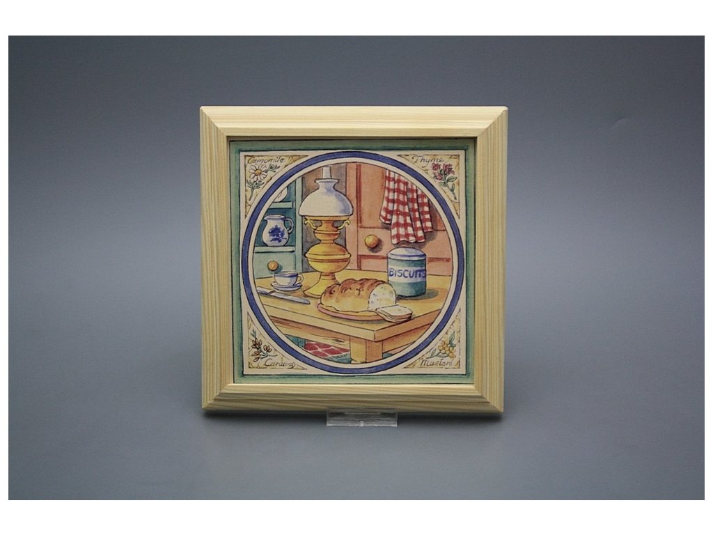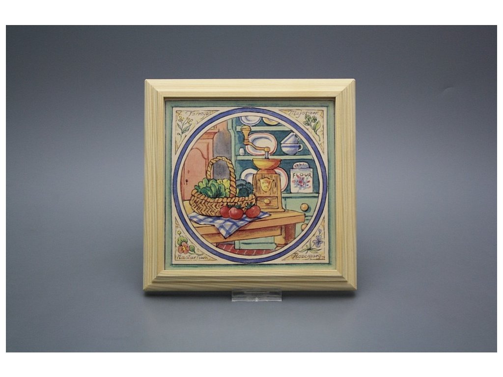 Keramisches Bild zum Aufhängen mit Holzrahmen, Temperatur beim Ausbrennen des Motivs in Höhe von 820°C, abriebfestes, waschbares Dekor.