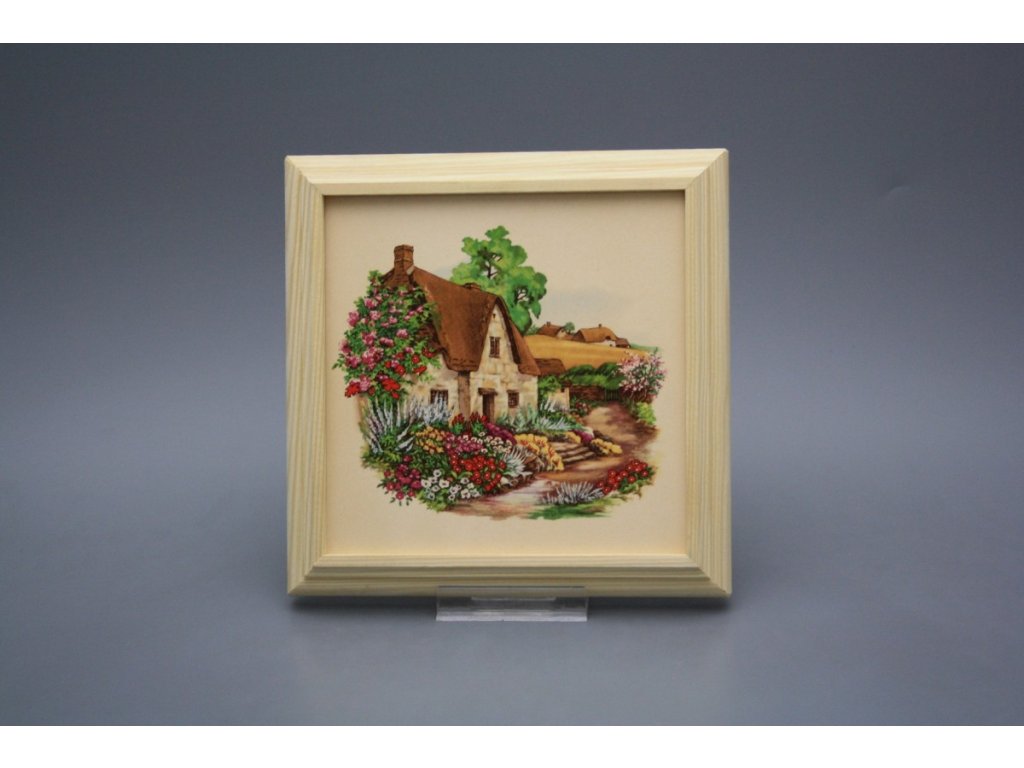 Keramisches Bild zum Aufhängen mit Holzrahmen, Temperatur beim Ausbrennen des Motivs in Höhe von 820°C, abriebfestes, waschbares Dekor.