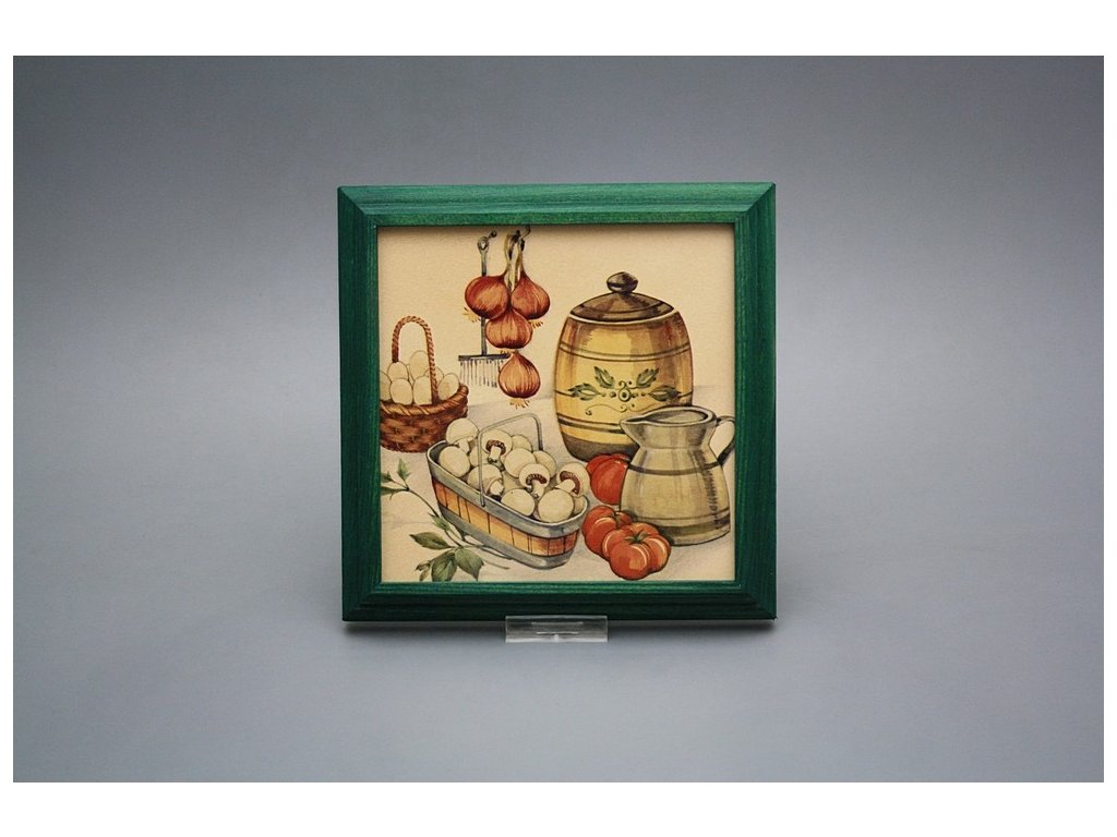 Keramisches Bild zum Aufhängen mit Holzrahmen, Temperatur beim Ausbrennen des Motivs in Höhe von 820°C, abriebfestes, waschbares Dekor.