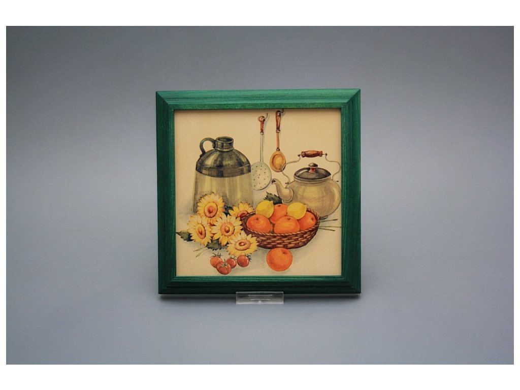 Keramisches Bild zum Aufhängen mit Holzrahmen, Temperatur beim Ausbrennen des Motivs in Höhe von 820°C, abriebfestes, waschbares Dekor.