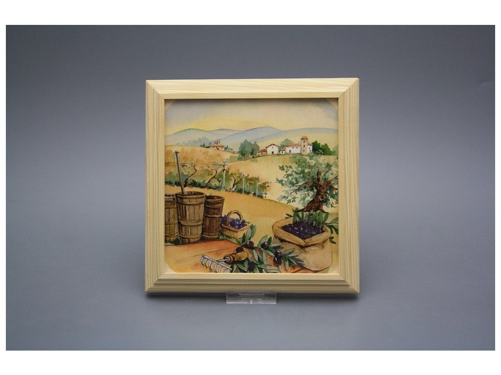 Keramisches Bild zum Aufhängen mit Holzrahmen, Temperatur beim Ausbrennen des Motivs in Höhe von 820°C, abriebfestes, waschbares Dekor.