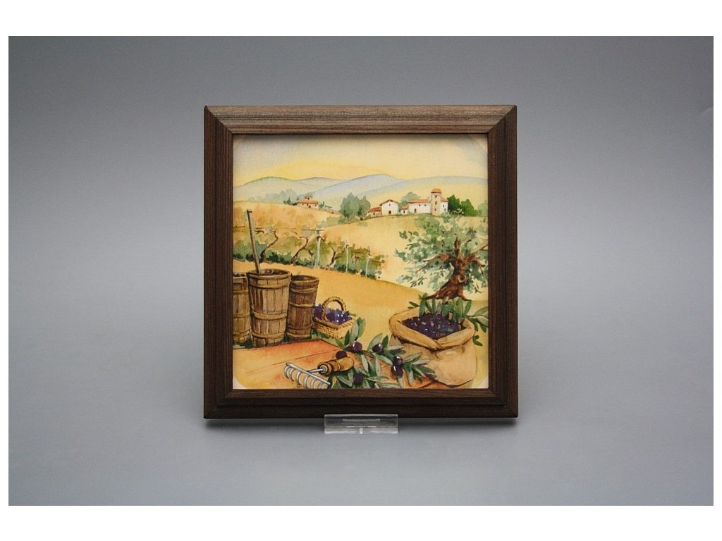 Keramisches Bild zum Aufhängen mit Holzrahmen, Temperatur beim Ausbrennen des Motivs in Höhe von 820°C, abriebfestes, waschbares Dekor.