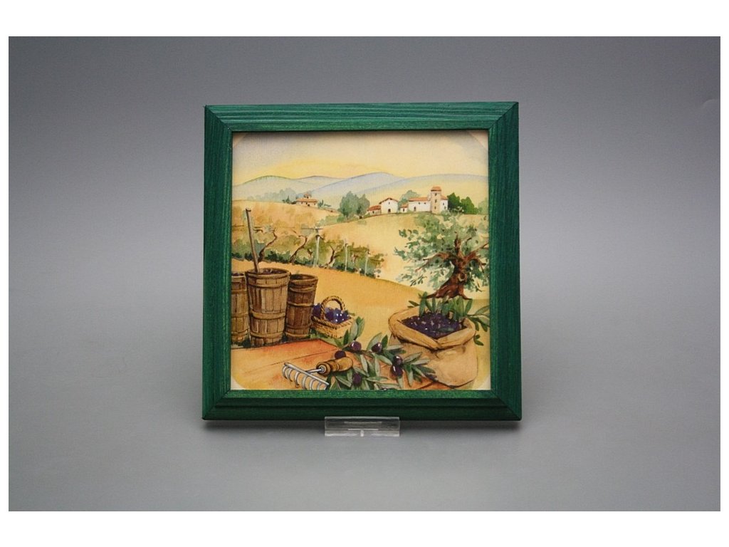 Keramisches Bild zum Aufhängen mit Holzrahmen, Temperatur beim Ausbrennen des Motivs in Höhe von 820°C, abriebfestes, waschbares Dekor.