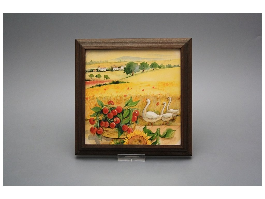 Keramisches Bild zum Aufhängen mit Holzrahmen, Temperatur beim Ausbrennen des Motivs in Höhe von 820°C, abriebfestes, waschbares Dekor.