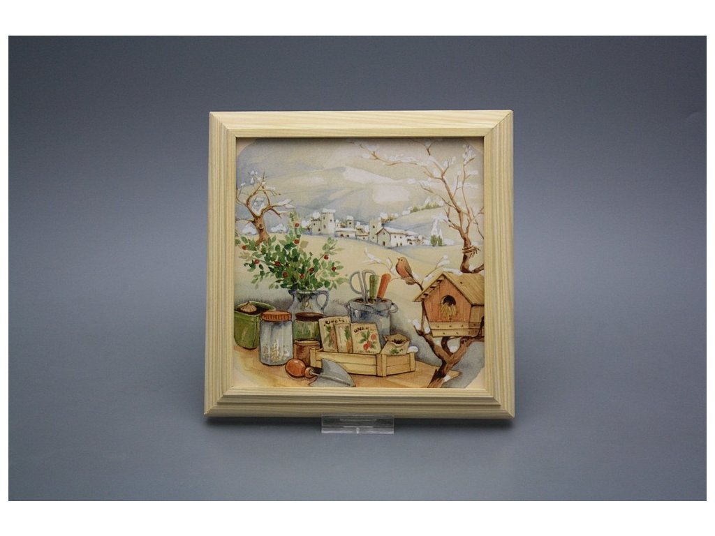 Keramisches Bild zum Aufhängen mit Holzrahmen, Temperatur beim Ausbrennen des Motivs in Höhe von 820°C, abriebfestes, waschbares Dekor.
