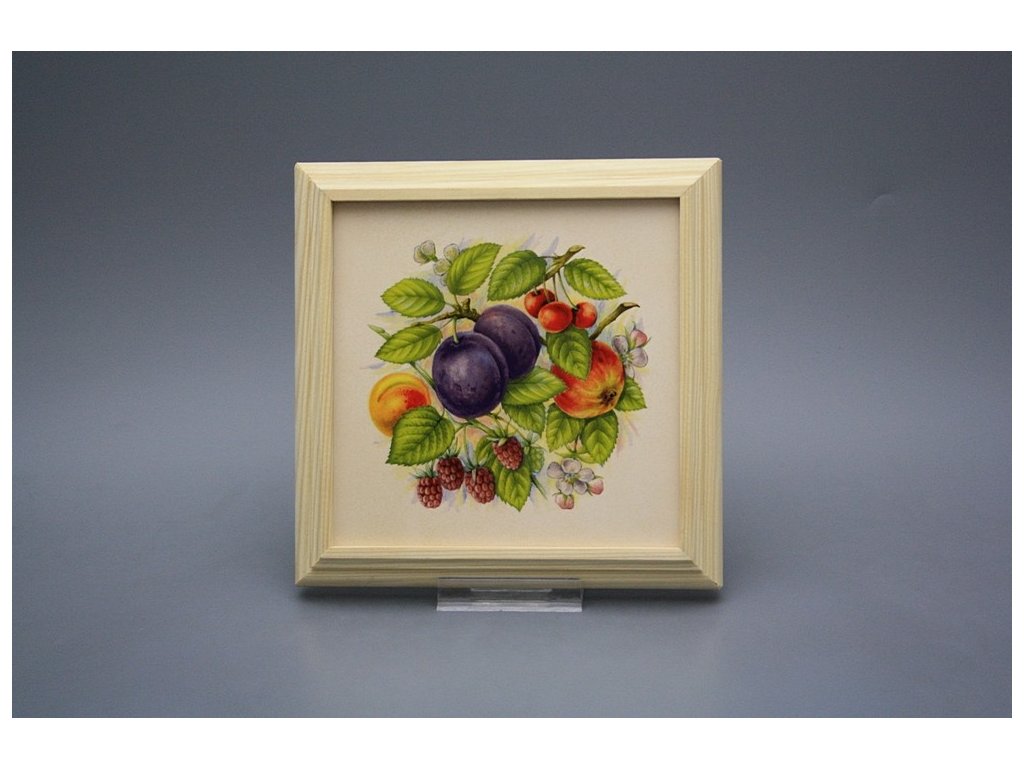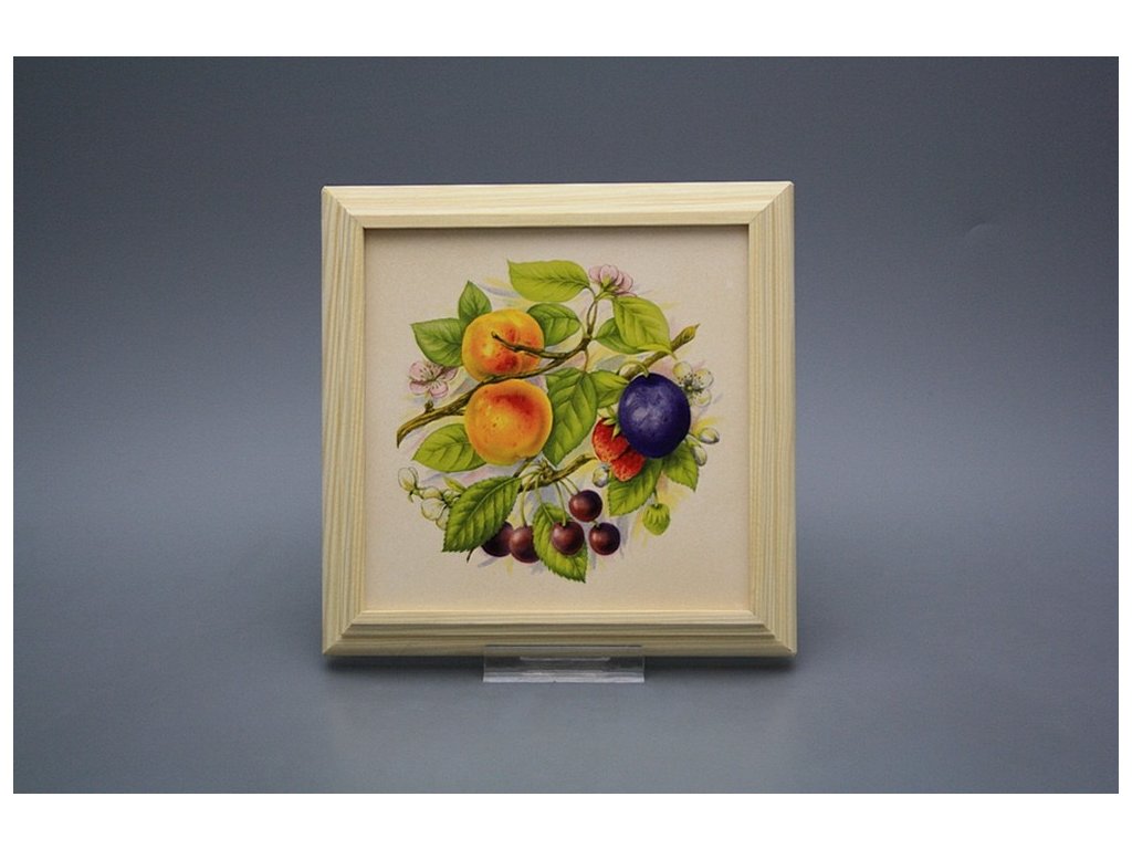 Keramisches Bild zum Aufhängen mit Holzrahmen, Temperatur beim Ausbrennen des Motivs in Höhe von 820°C, abriebfestes, waschbares Dekor.