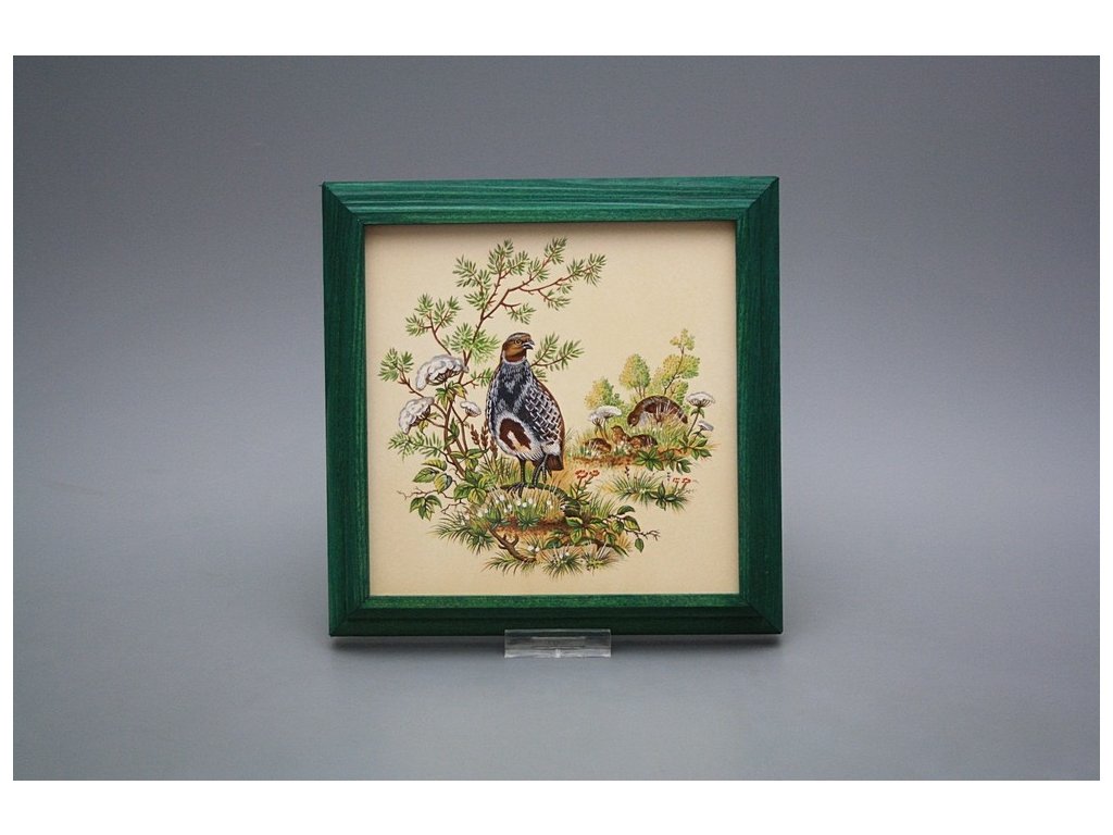 Keramisches Bild zum Aufhängen mit Holzrahmen, Temperatur beim Ausbrennen des Motivs in Höhe von 820°C, abriebfestes, waschbares Dekor.