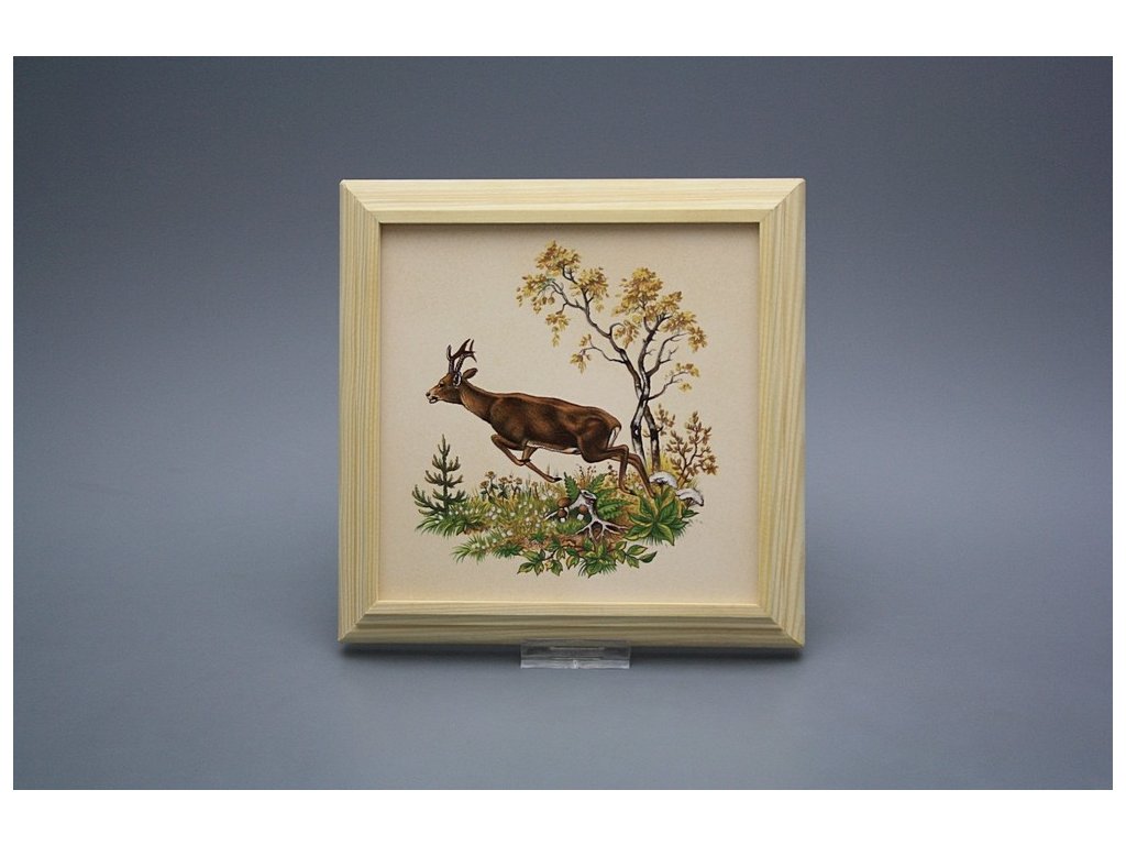 Keramisches Bild zum Aufhängen mit Holzrahmen, Temperatur beim Ausbrennen des Motivs in Höhe von 820°C, abriebfestes, waschbares Dekor.