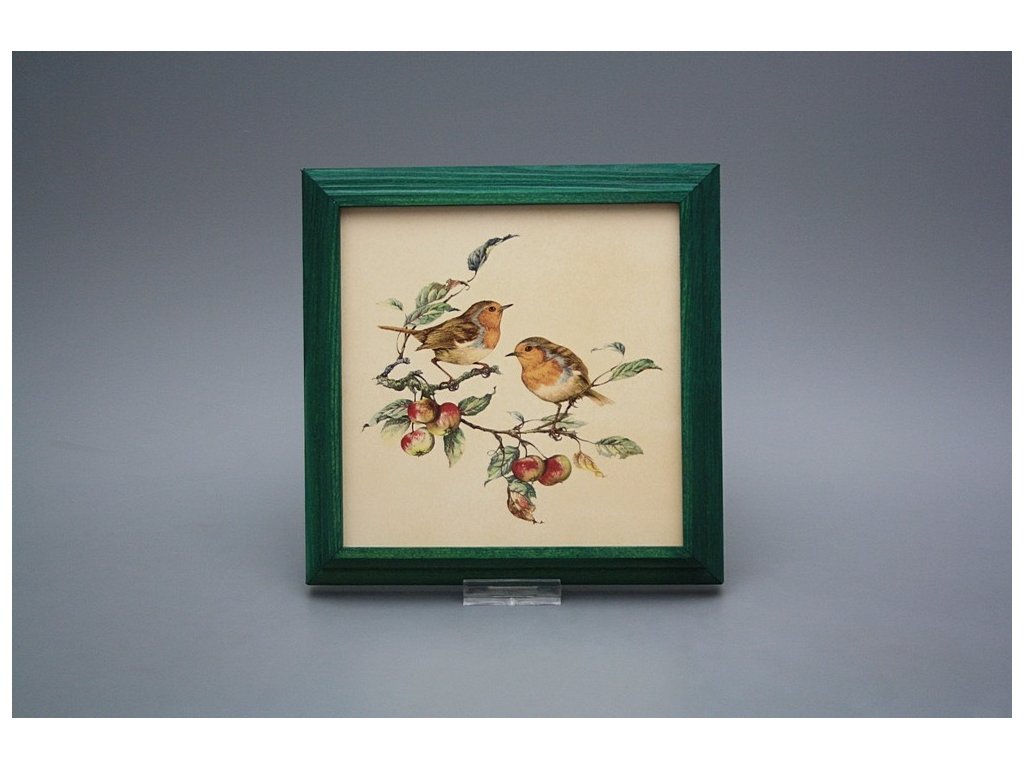 Keramisches Bild zum Aufhängen mit Holzrahmen, Temperatur beim Ausbrennen des Motivs in Höhe von 820°C, abriebfestes, waschbares Dekor.