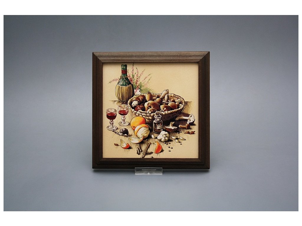 Keramisches Bild zum Aufhängen mit Holzrahmen, Temperatur beim Ausbrennen des Motivs in Höhe von 820°C, abriebfestes, waschbares Dekor.