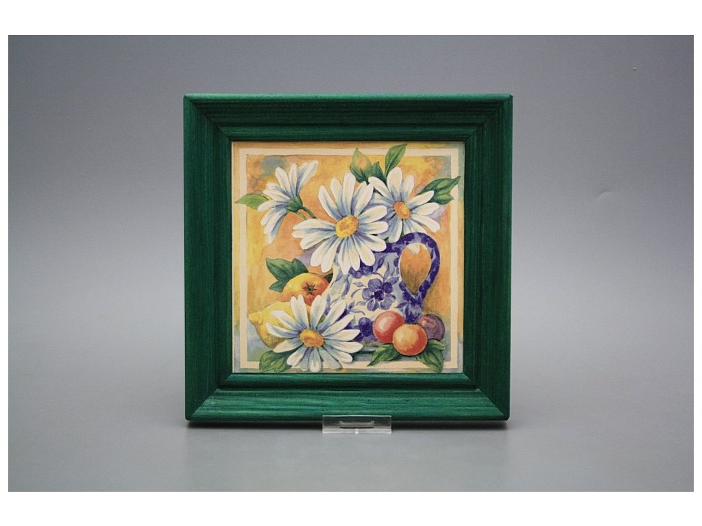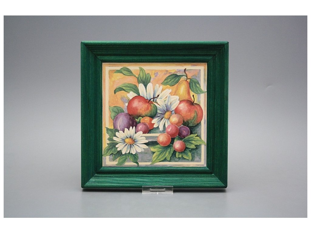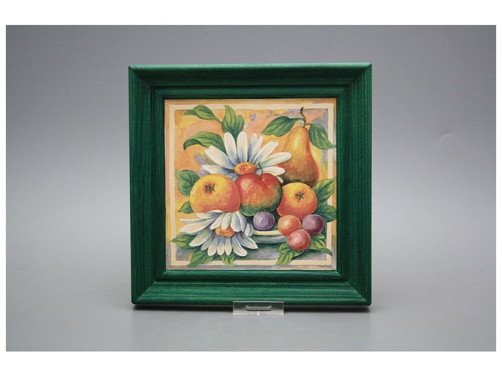 Keramisches Bild zum Aufhängen mit Holzrahmen, Temperatur beim Ausbrennen des Motivs in Höhe von 820°C, abriebfestes, waschbares Dekor.