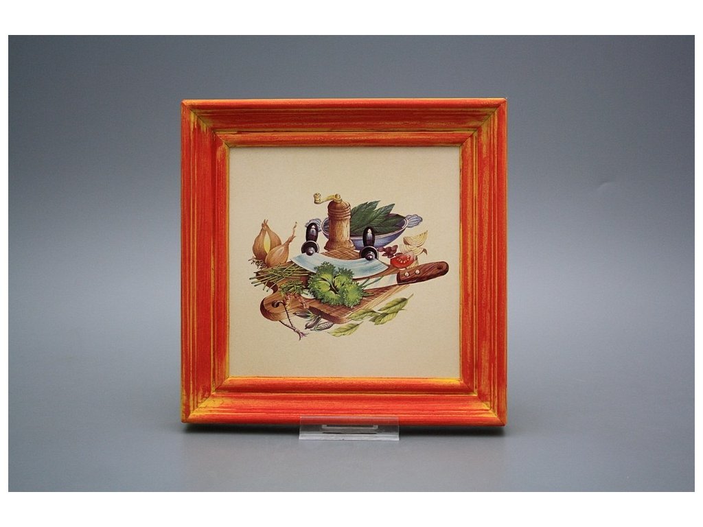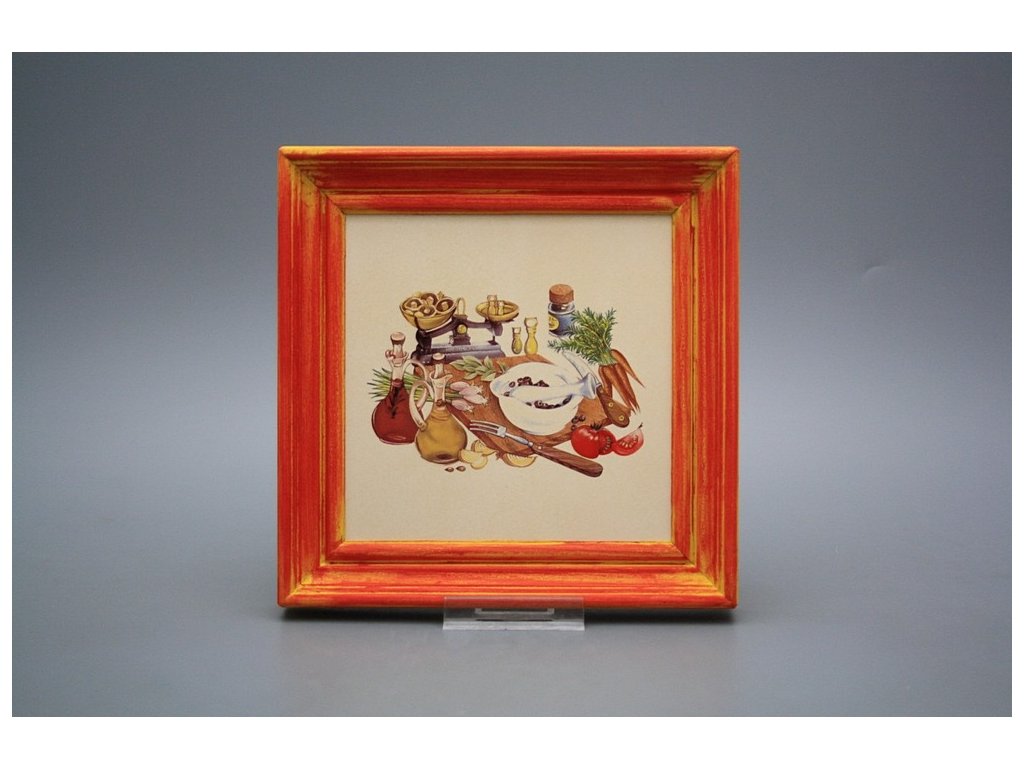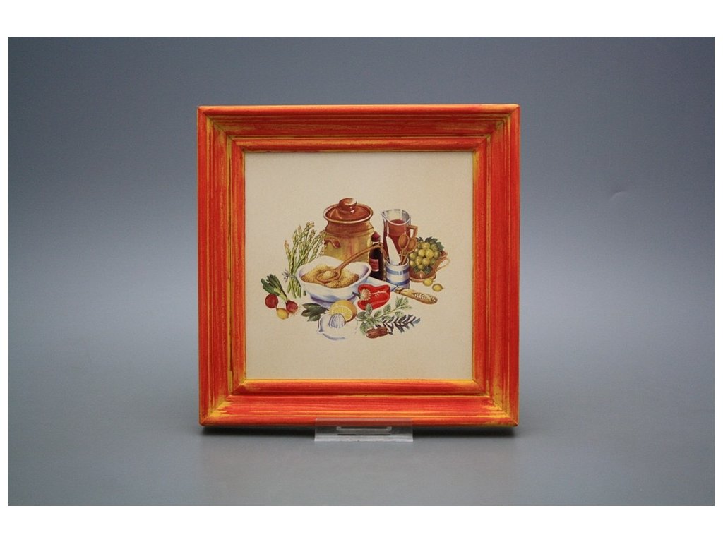 Keramisches Bild zum Aufhängen mit Holzrahmen, Temperatur beim Ausbrennen des Motivs in Höhe von 820°C, abriebfestes, waschbares Dekor.