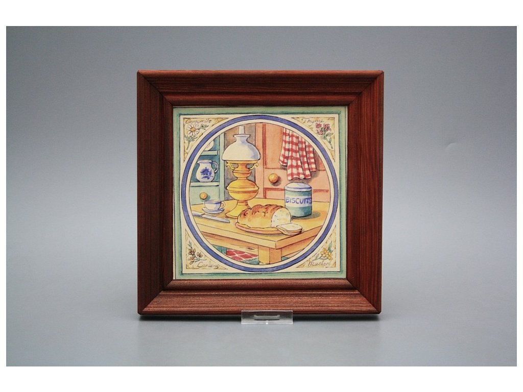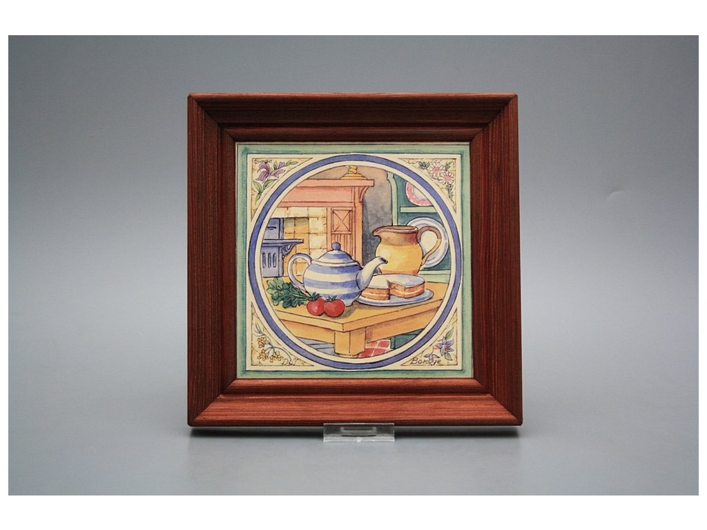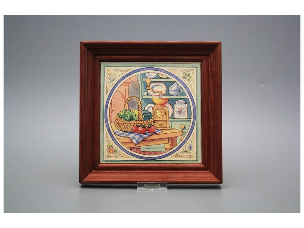 Keramisches Bild zum Aufhängen mit Holzrahmen, Temperatur beim Ausbrennen des Motivs in Höhe von 820°C, abriebfestes, waschbares Dekor.