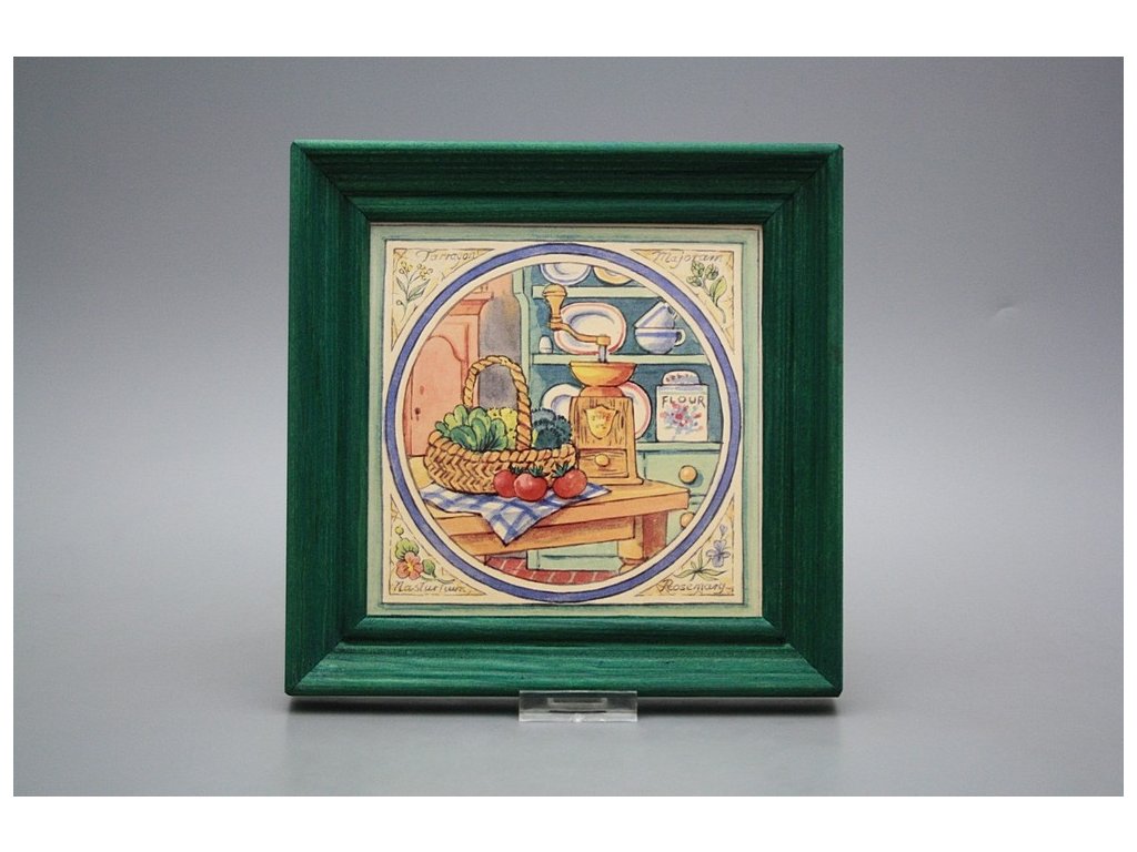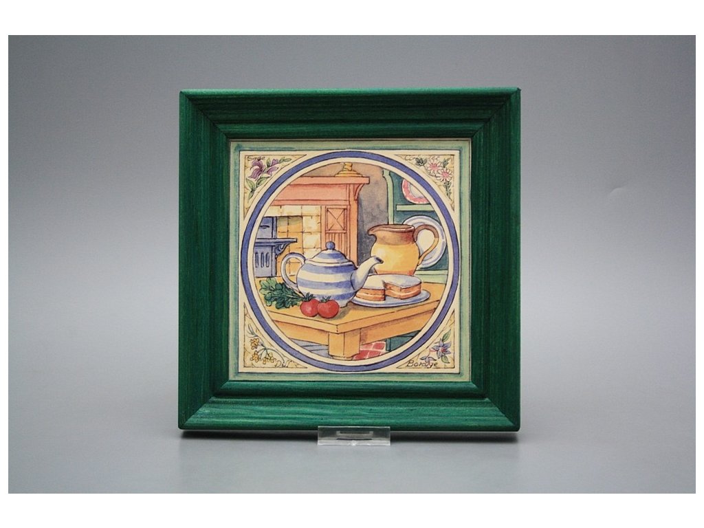 Keramisches Bild zum Aufhängen mit Holzrahmen, Temperatur beim Ausbrennen des Motivs in Höhe von 820°C, abriebfestes, waschbares Dekor.