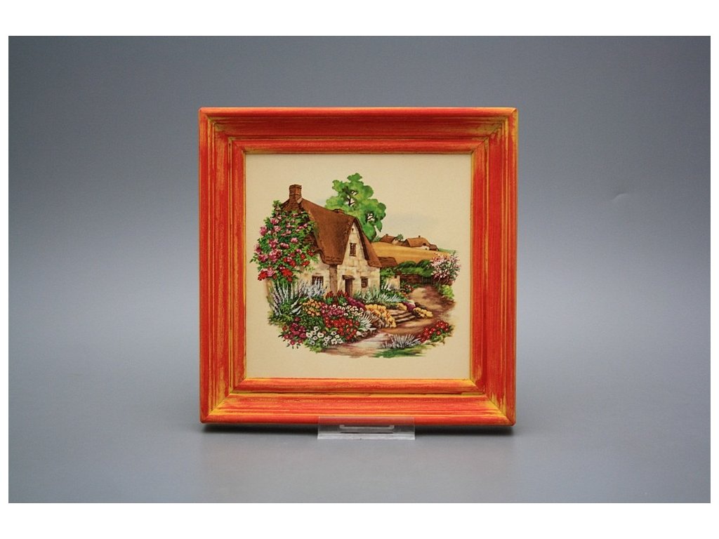 Keramisches Bild zum Aufhängen mit Holzrahmen, Temperatur beim Ausbrennen des Motivs in Höhe von 820°C, abriebfestes, waschbares Dekor.