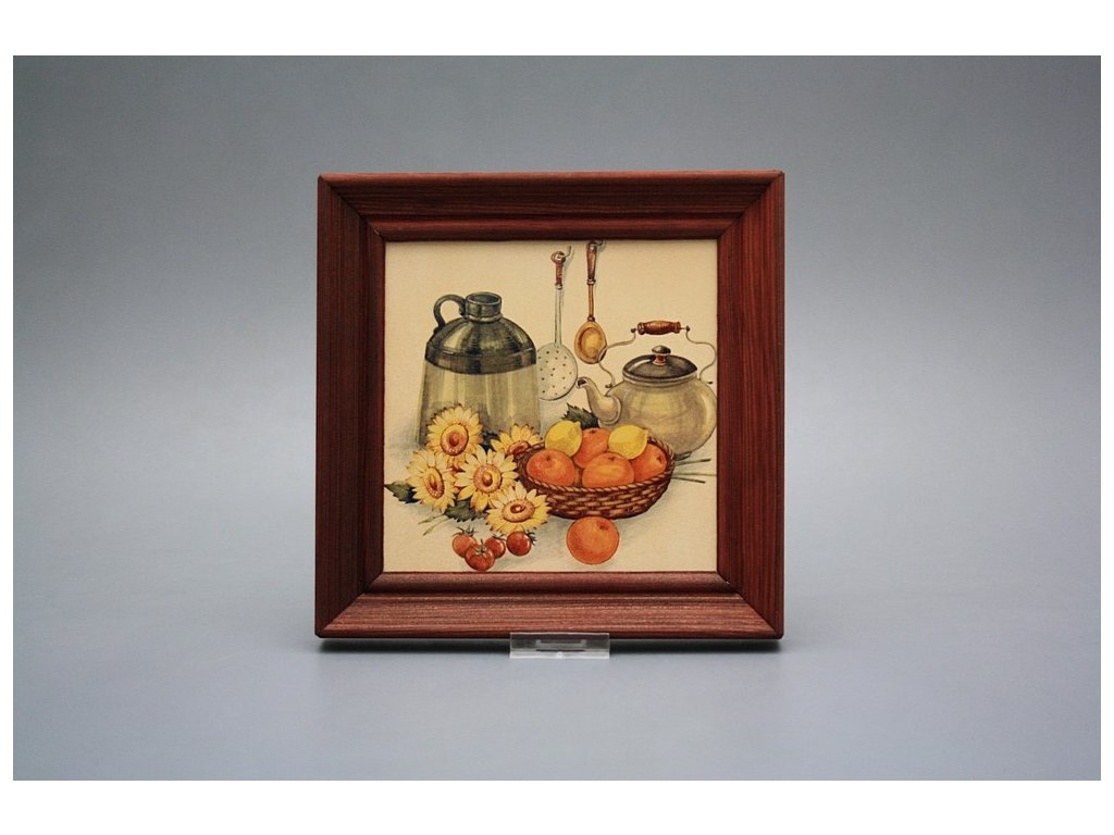 Keramisches Bild zum Aufhängen mit Holzrahmen, Temperatur beim Ausbrennen des Motivs in Höhe von 820°C, abriebfestes, waschbares Dekor.