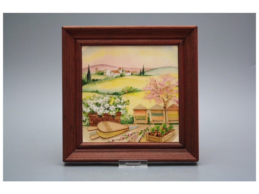 Keramisches Bild zum Aufhängen mit Holzrahmen, Temperatur beim Ausbrennen des Motivs in Höhe von 820°C, abriebfestes, waschbares Dekor.