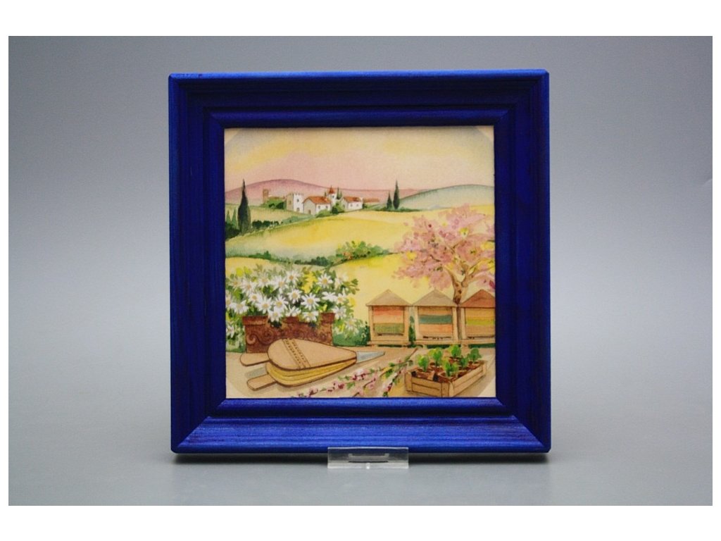 Keramisches Bild zum Aufhängen mit Holzrahmen, Temperatur beim Ausbrennen des Motivs in Höhe von 820°C, abriebfestes, waschbares Dekor.