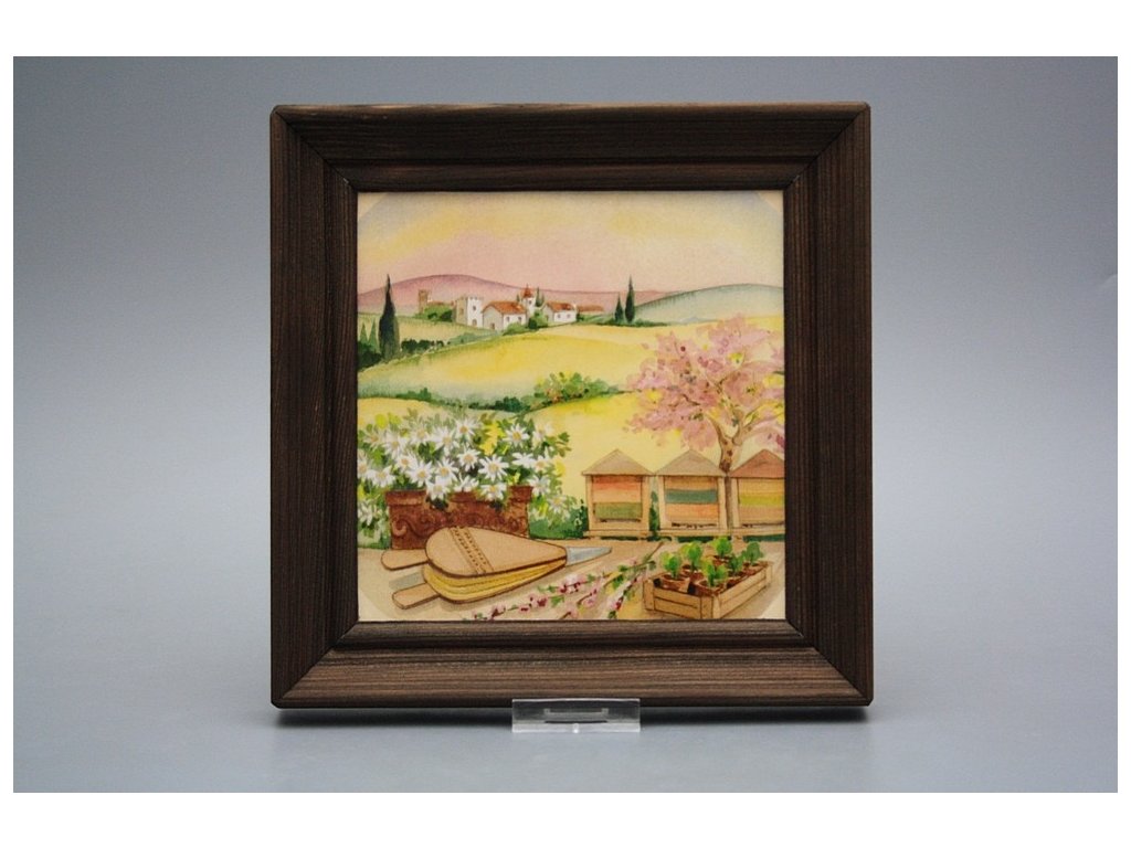 Keramisches Bild zum Aufhängen mit Holzrahmen, Temperatur beim Ausbrennen des Motivs in Höhe von 820°C, abriebfestes, waschbares Dekor.