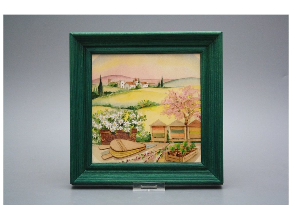 Keramisches Bild zum Aufhängen mit Holzrahmen, Temperatur beim Ausbrennen des Motivs in Höhe von 820°C, abriebfestes, waschbares Dekor.