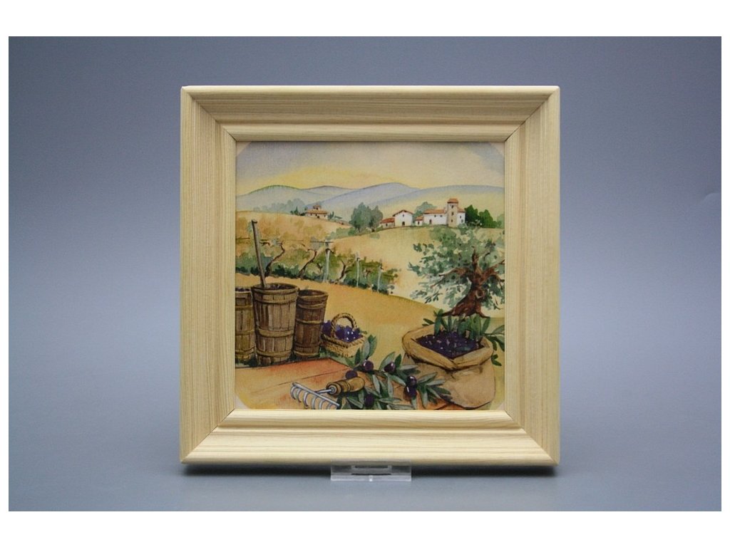 Keramisches Bild zum Aufhängen mit Holzrahmen, Temperatur beim Ausbrennen des Motivs in Höhe von 820°C, abriebfestes, waschbares Dekor.