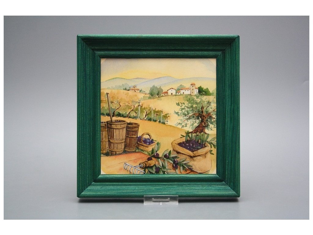 Keramisches Bild zum Aufhängen mit Holzrahmen, Temperatur beim Ausbrennen des Motivs in Höhe von 820°C, abriebfestes, waschbares Dekor.