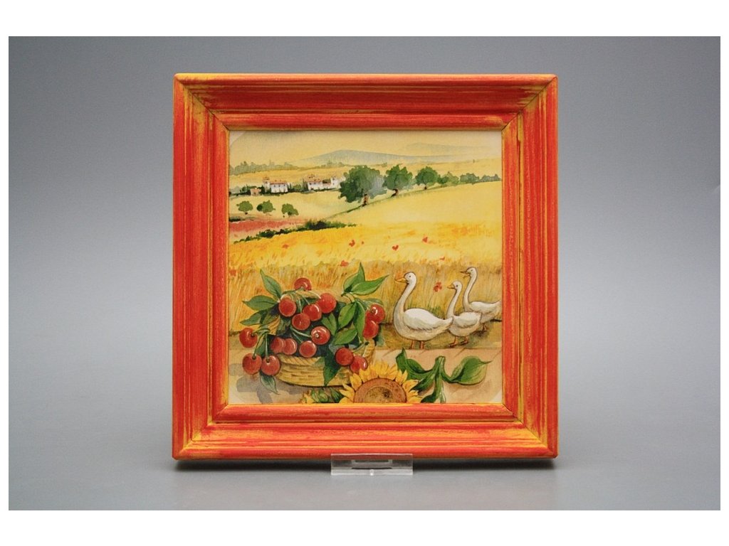 Keramisches Bild zum Aufhängen mit Holzrahmen, Temperatur beim Ausbrennen des Motivs in Höhe von 820°C, abriebfestes, waschbares Dekor.