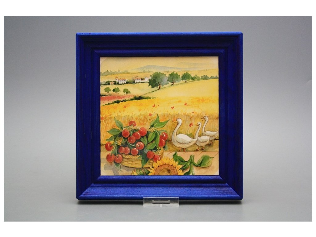 Keramisches Bild zum Aufhängen mit Holzrahmen, Temperatur beim Ausbrennen des Motivs in Höhe von 820°C, abriebfestes, waschbares Dekor.