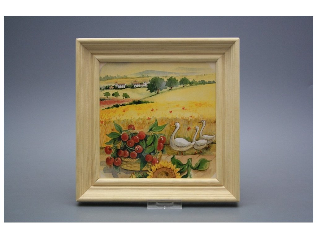 Keramisches Bild zum Aufhängen mit Holzrahmen, Temperatur beim Ausbrennen des Motivs in Höhe von 820°C, abriebfestes, waschbares Dekor.