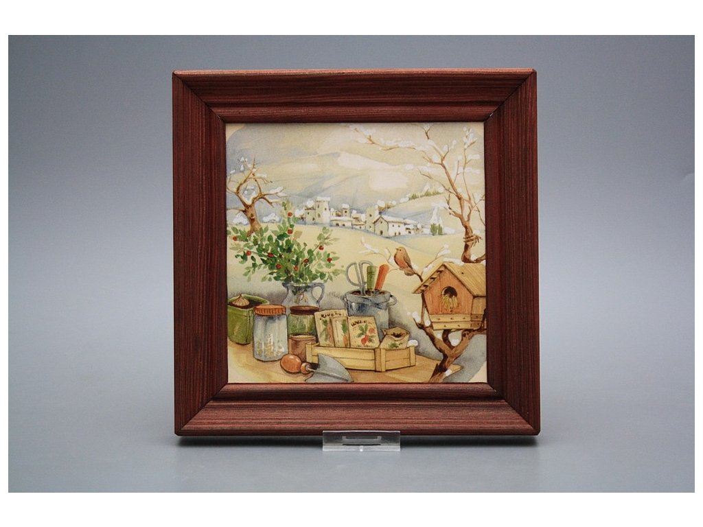 Keramisches Bild zum Aufhängen mit Holzrahmen, Temperatur beim Ausbrennen des Motivs in Höhe von 820°C, abriebfestes, waschbares Dekor.