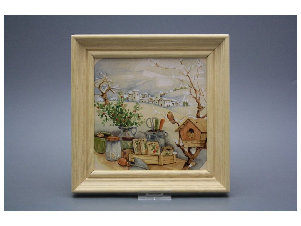 Keramisches Bild zum Aufhängen mit Holzrahmen, Temperatur beim Ausbrennen des Motivs in Höhe von 820°C, abriebfestes, waschbares Dekor.