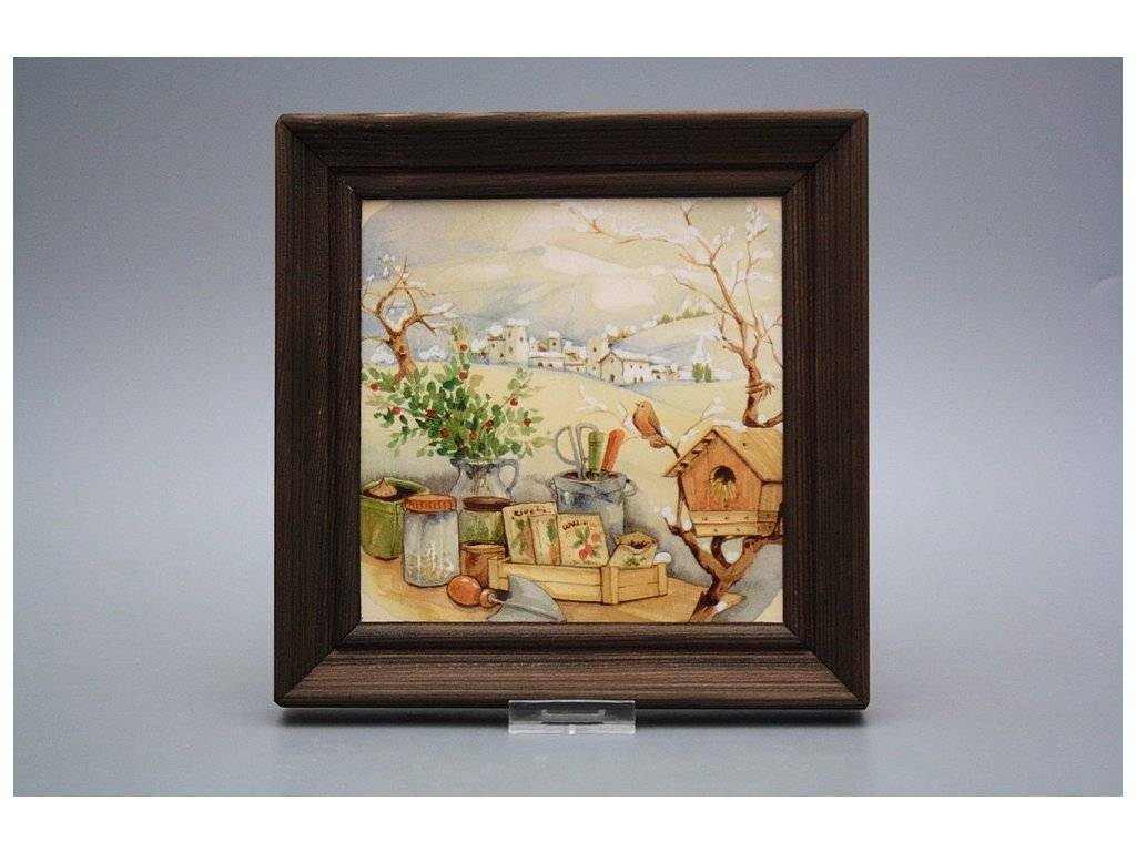 Keramisches Bild zum Aufhängen mit Holzrahmen, Temperatur beim Ausbrennen des Motivs in Höhe von 820°C, abriebfestes, waschbares Dekor.