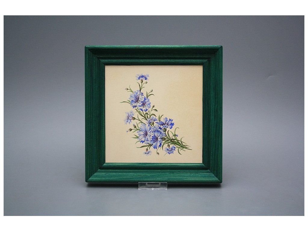 Keramisches Bild zum Aufhängen mit Holzrahmen, Temperatur beim Ausbrennen des Motivs in Höhe von 820°C, abriebfestes, waschbares Dekor.