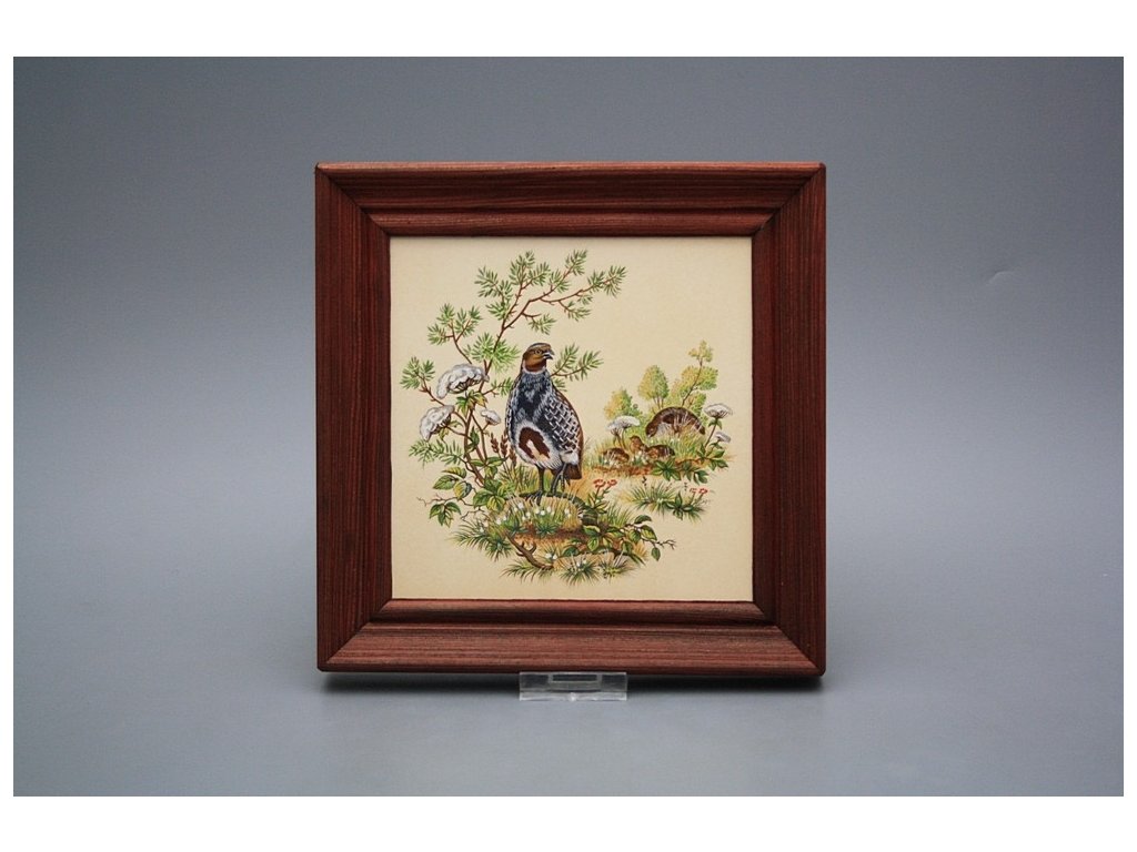 Keramisches Bild zum Aufhängen mit Holzrahmen, Temperatur beim Ausbrennen des Motivs in Höhe von 820°C, abriebfestes, waschbares Dekor.