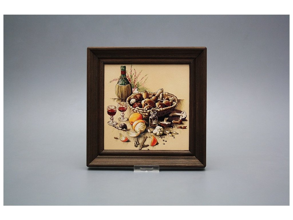 Keramisches Bild zum Aufhängen mit Holzrahmen, Temperatur beim Ausbrennen des Motivs in Höhe von 820°C, abriebfestes, waschbares Dekor.