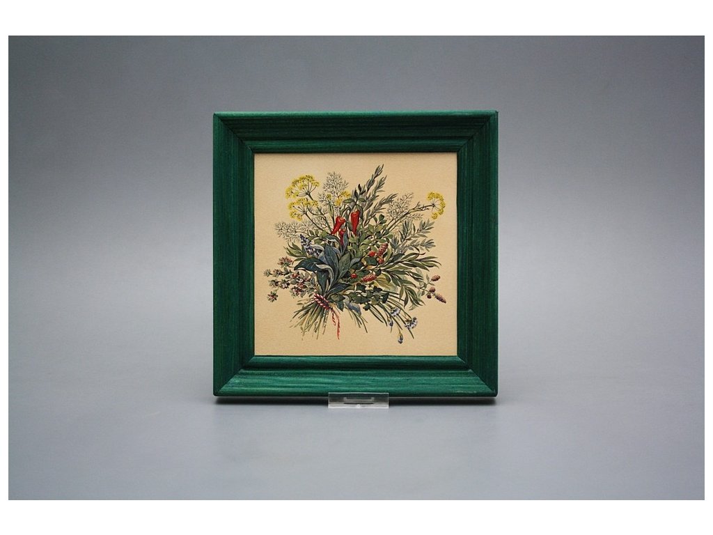 Keramisches Bild zum Aufhängen mit Holzrahmen, Temperatur beim Ausbrennen des Motivs in Höhe von 820°C, abriebfestes, waschbares Dekor.