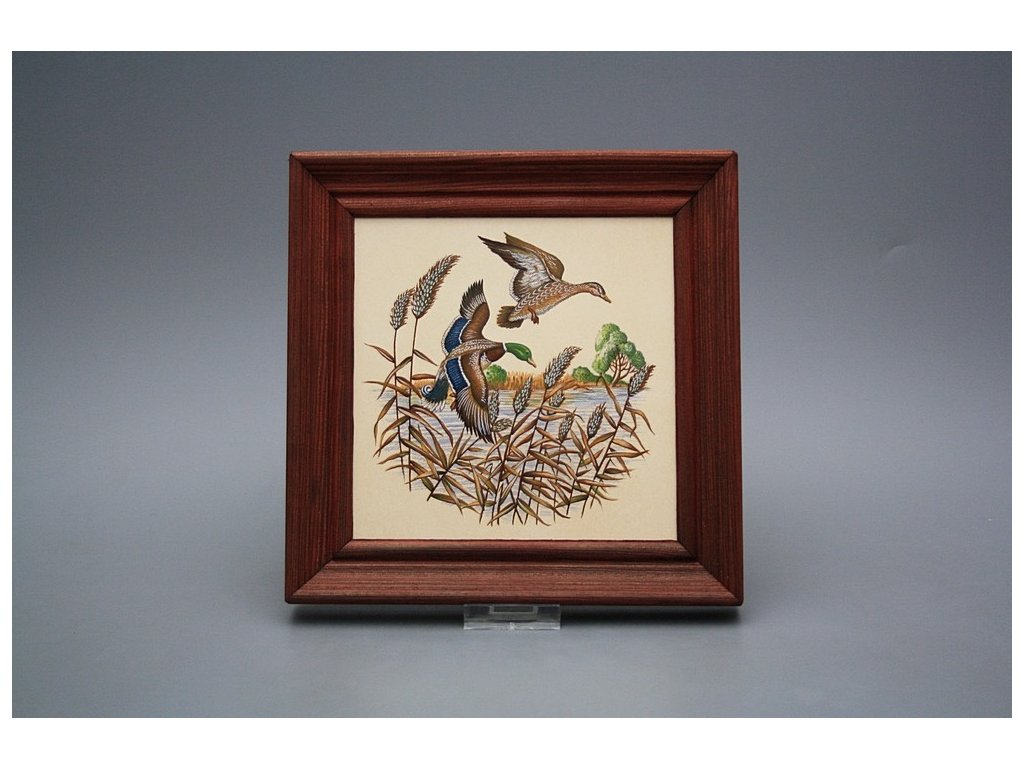 Keramisches Bild zum Aufhängen mit Holzrahmen, Temperatur beim Ausbrennen des Motivs in Höhe von 820°C, abriebfestes, waschbares Dekor.
