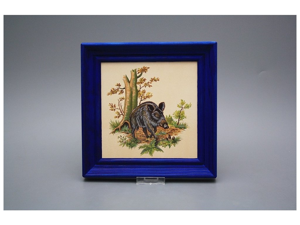 Keramisches Bild zum Aufhängen mit Holzrahmen, Temperatur beim Ausbrennen des Motivs in Höhe von 820°C, abriebfestes, waschbares Dekor.