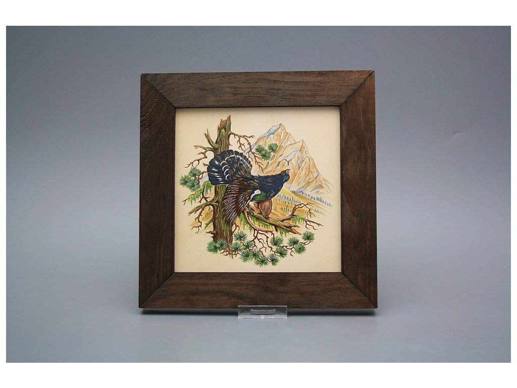 Keramisches Bild zum Aufhängen mit Holzrahmen, Temperatur beim Ausbrennen des Motivs in Höhe von 820°C, abriebfestes, waschbares Dekor.