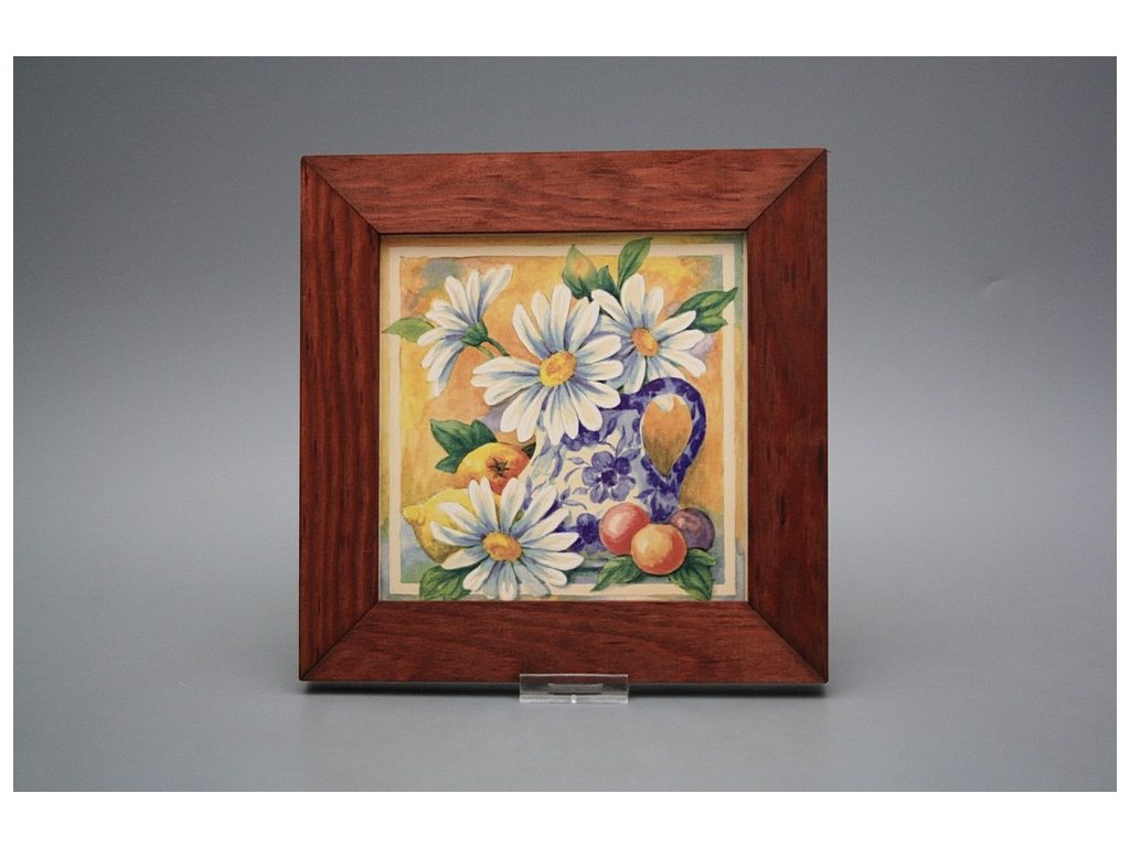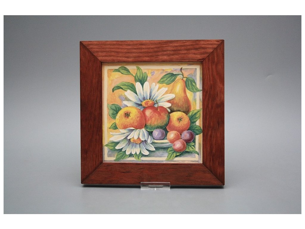 Keramisches Bild zum Aufhängen mit Holzrahmen, Temperatur beim Ausbrennen des Motivs in Höhe von 820°C, abriebfestes, waschbares Dekor.