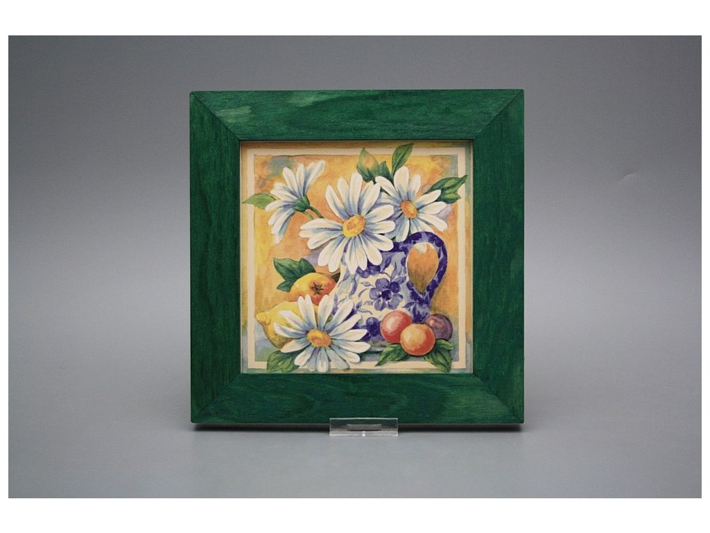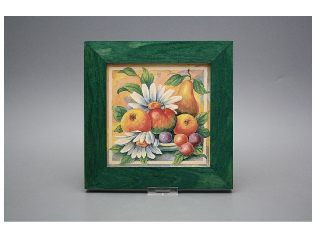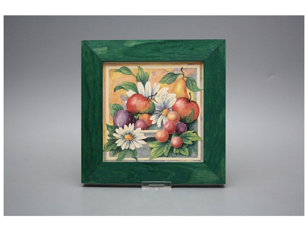 Keramisches Bild zum Aufhängen mit Holzrahmen, Temperatur beim Ausbrennen des Motivs in Höhe von 820°C, abriebfestes, waschbares Dekor.