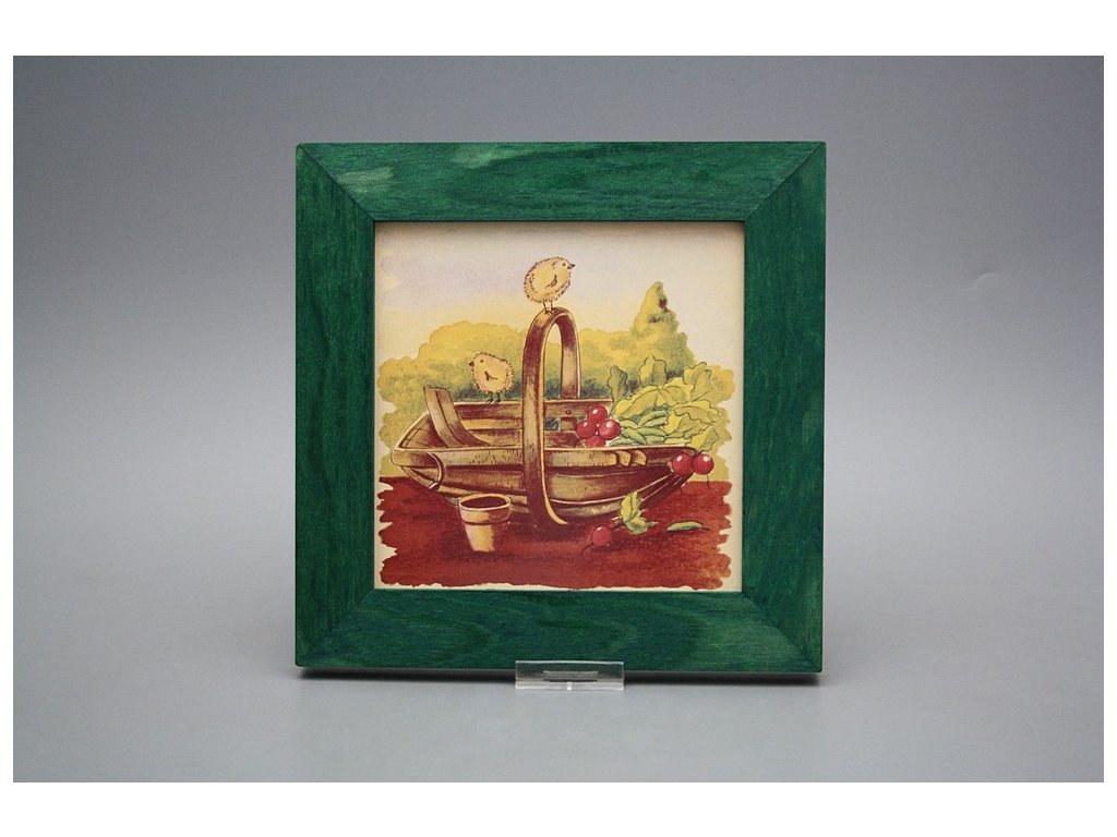 Keramisches Bild zum Aufhängen mit Holzrahmen, Temperatur beim Ausbrennen des Motivs in Höhe von 820°C, abriebfestes, waschbares Dekor.