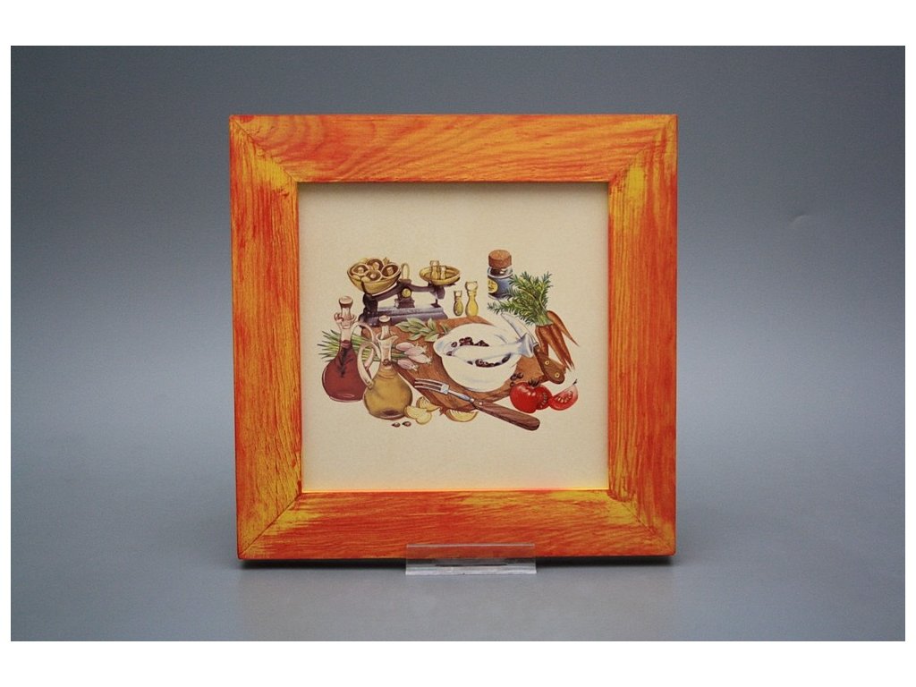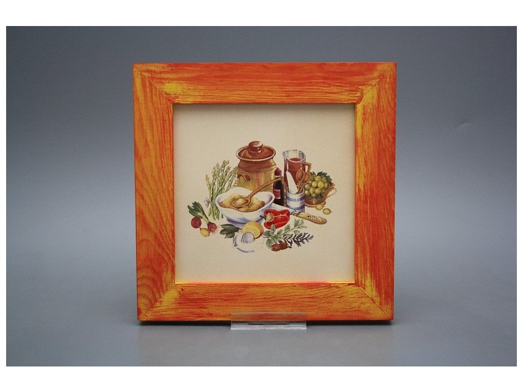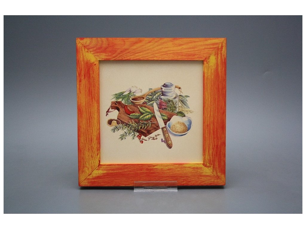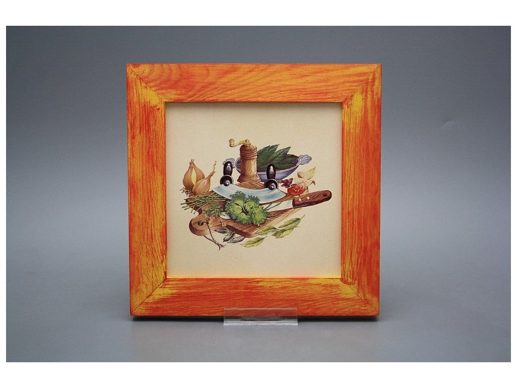 Keramisches Bild zum Aufhängen mit Holzrahmen, Temperatur beim Ausbrennen des Motivs in Höhe von 820°C, abriebfestes, waschbares Dekor.