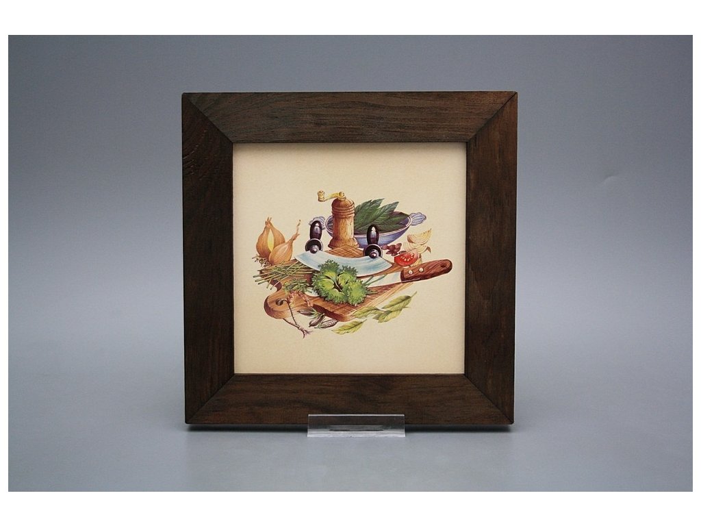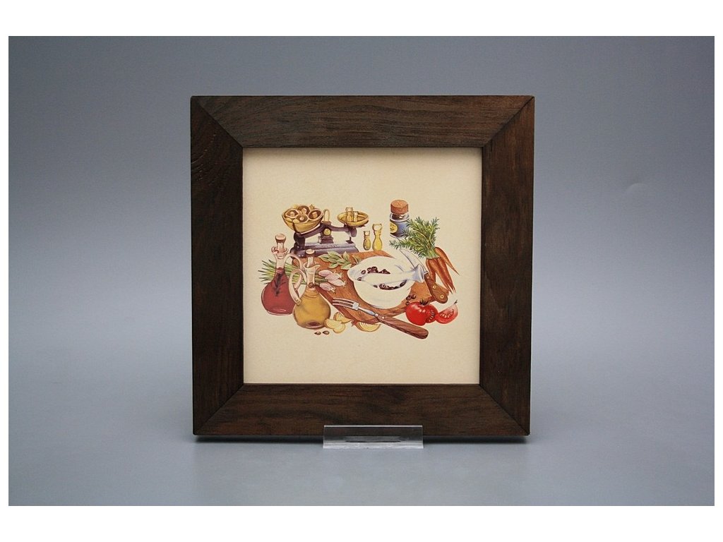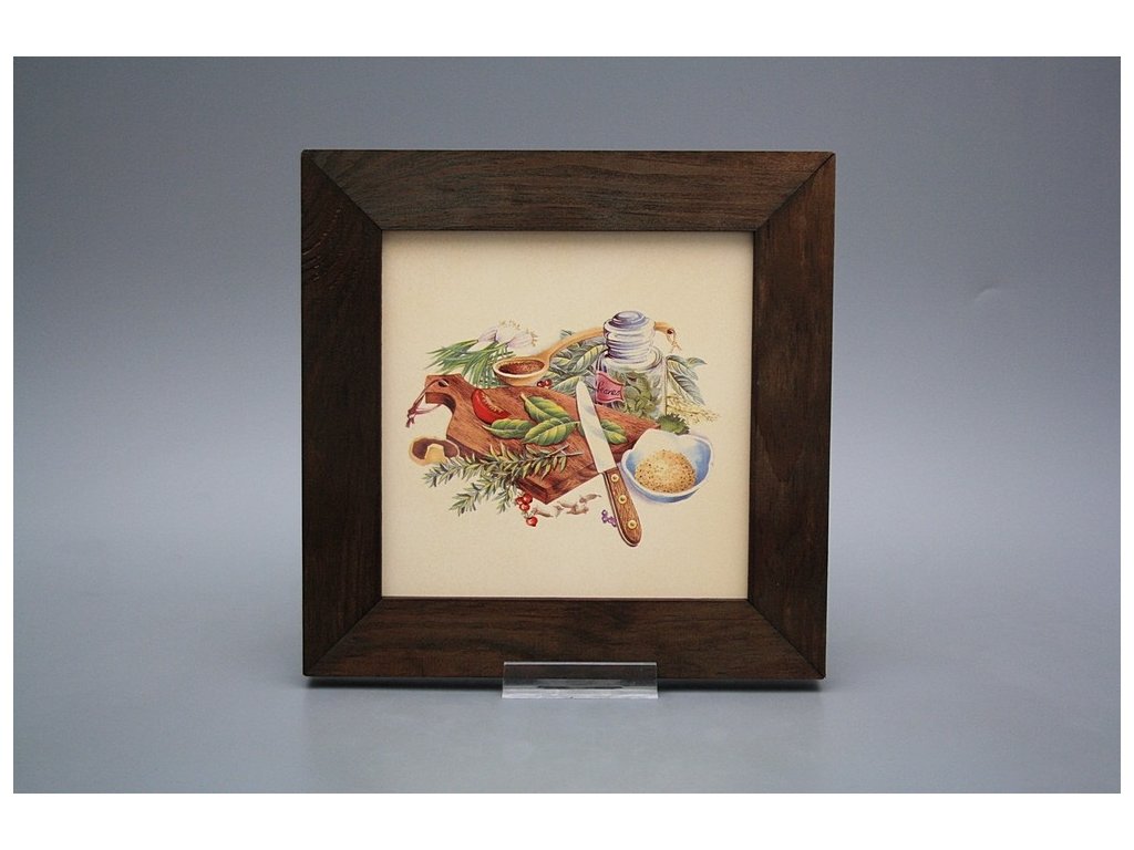 Keramisches Bild zum Aufhängen mit Holzrahmen, Temperatur beim Ausbrennen des Motivs in Höhe von 820°C, abriebfestes, waschbares Dekor.