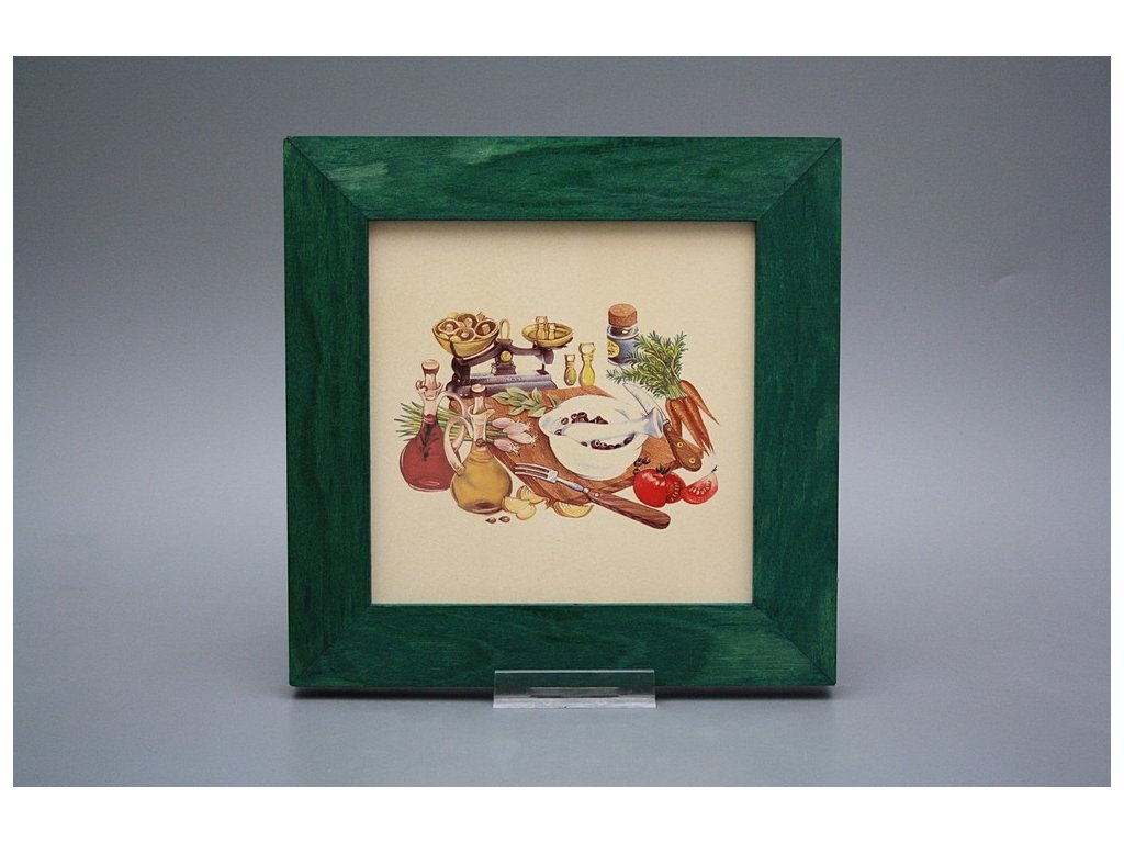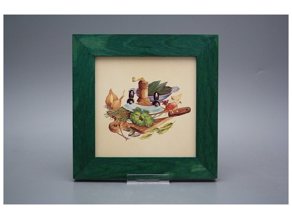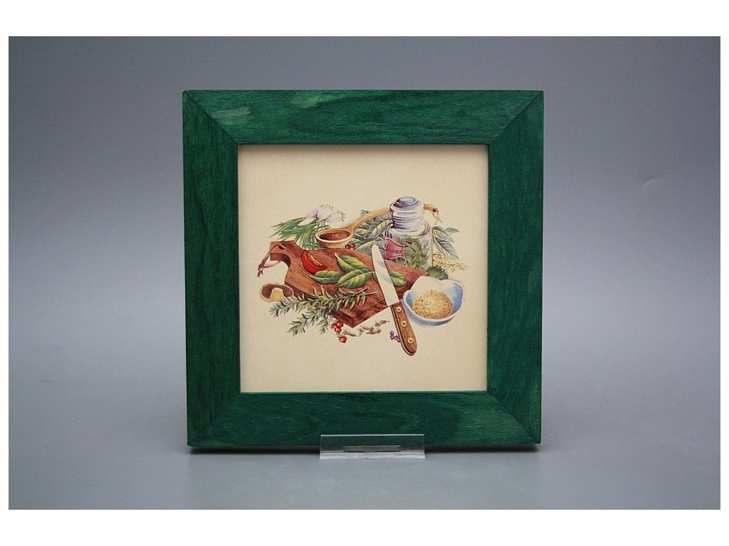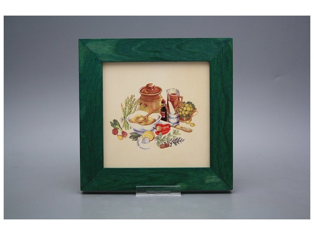 Keramisches Bild zum Aufhängen mit Holzrahmen, Temperatur beim Ausbrennen des Motivs in Höhe von 820°C, abriebfestes, waschbares Dekor.