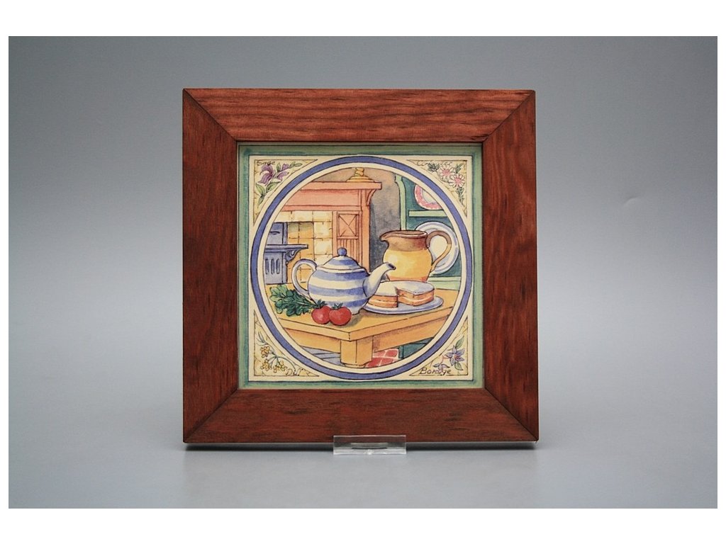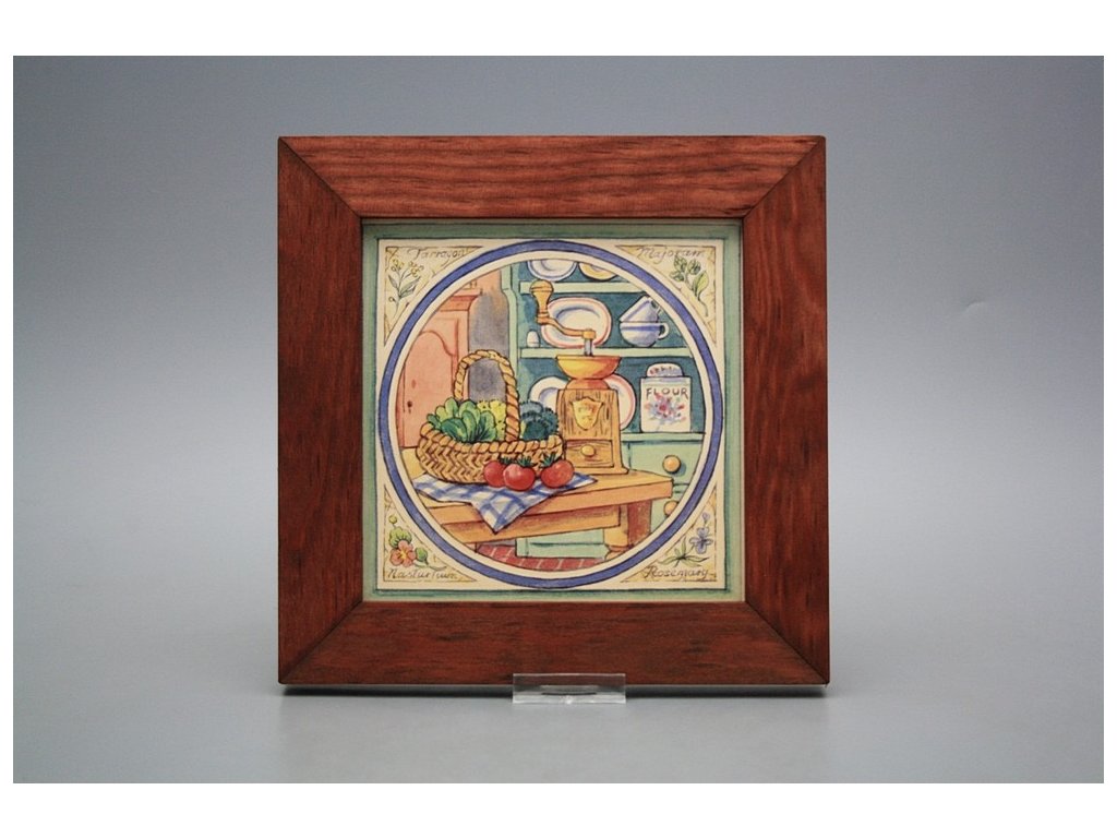 Keramisches Bild zum Aufhängen mit Holzrahmen, Temperatur beim Ausbrennen des Motivs in Höhe von 820°C, abriebfestes, waschbares Dekor.