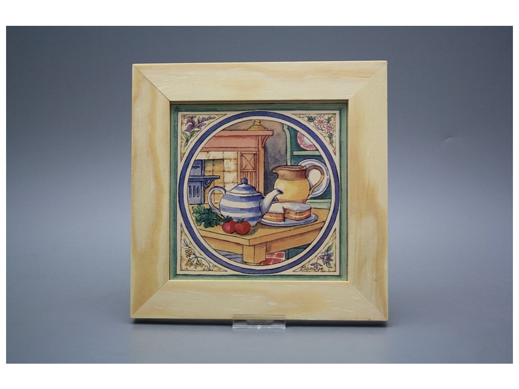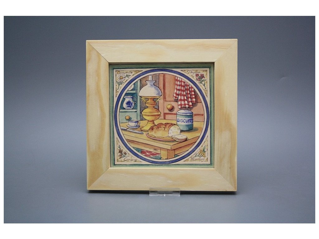 Keramisches Bild zum Aufhängen mit Holzrahmen, Temperatur beim Ausbrennen des Motivs in Höhe von 820°C, abriebfestes, waschbares Dekor.
